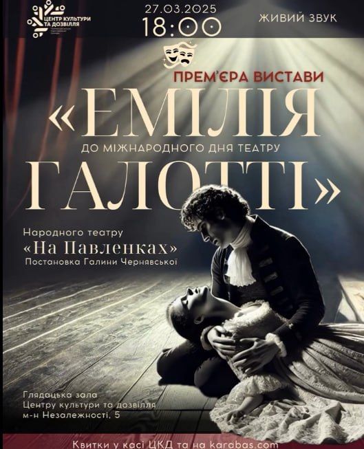 27 березня о 18:00 на сцені Центру культури та дозвілля Народний театр «На Павленках» представить прем’єру вистави «Емілія Галотті» — гостросюжетної трагедії Готгольда Лессінга.